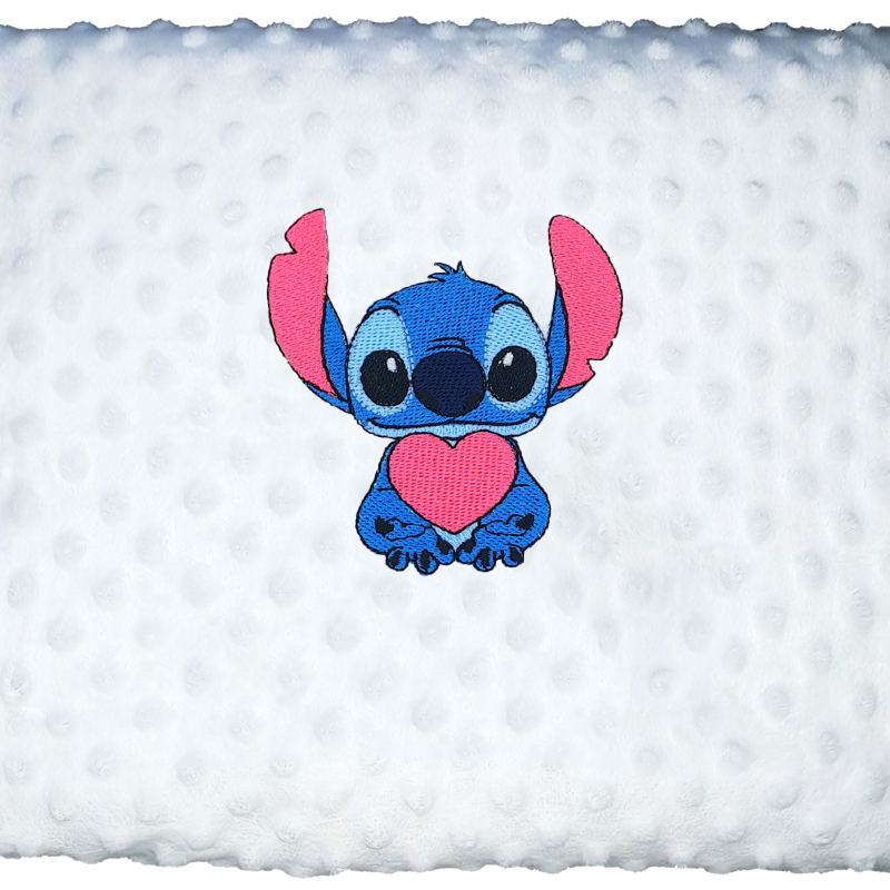 Une très belle couverture plumetis blanche brodée avec un motif " Stitch" de Disney.