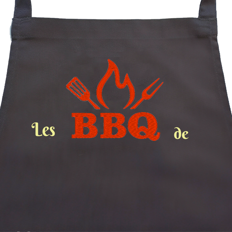 N'oubliez pas de sauvegarder votre personnalisation pour pouvoir l'ajouter au panierUn tablier de cuisine de très belle qualité. Il sera brodé et personnalisé sur le thème : " BBQ "